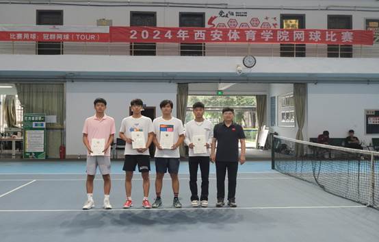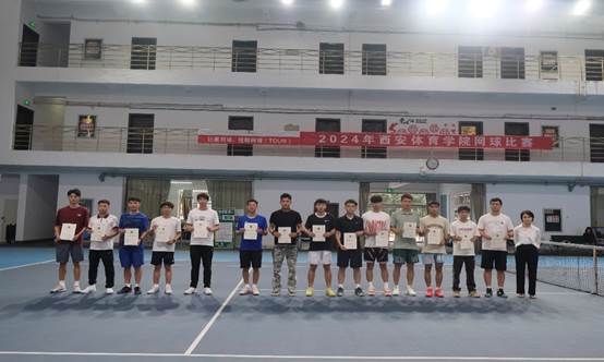 此次比赛由西安体育学院主办,运动休闲学院网球教研室承办,共设置男单甲、乙组,女单甲、乙组,男双甲、乙组,女双甲、乙组,乙组男团和乙组女团等10个竞赛项目。率先开战的乙组男团、女团比赛,2023级研究生队夺得女团第一名、休闲学院一队夺得男团第一名。甲乙两组男单、女单的竞争则更为激烈,来自甲组运动训练学院23级本科生徐志强、运动训练学院23级本科生乐敏思和乙组运动休闲学院2023级研究生周煊、运动训练学院21级本科生齐小卓在这激烈的比赛中,脱颖而出,摘得桂冠。甲乙两组男双、女双、混双比赛场面亦精彩绝伦,搭档之间相互补位、积极配合、彼此鼓励,甲组乐敏思和张文、齐记和施智诚分别赢得甲组女双、男双项目冠军,乙组张艾和孟叶玲、吕玮和张舒平分别赢得乙组女双、男双项目冠军。运动休闲学院院长任超学、副院长胡婕婷、竞赛训练处训练科科长宫贵楠为获奖运动员颁发了奖品、证书,并集体合影留念。