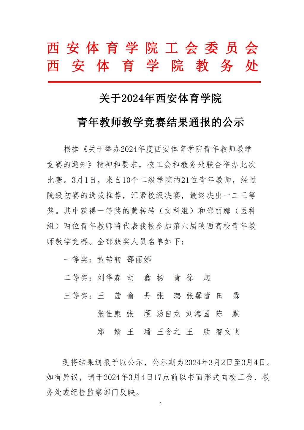 关于2024年度西安体育学院青年教师教学竞赛结果通报的公示