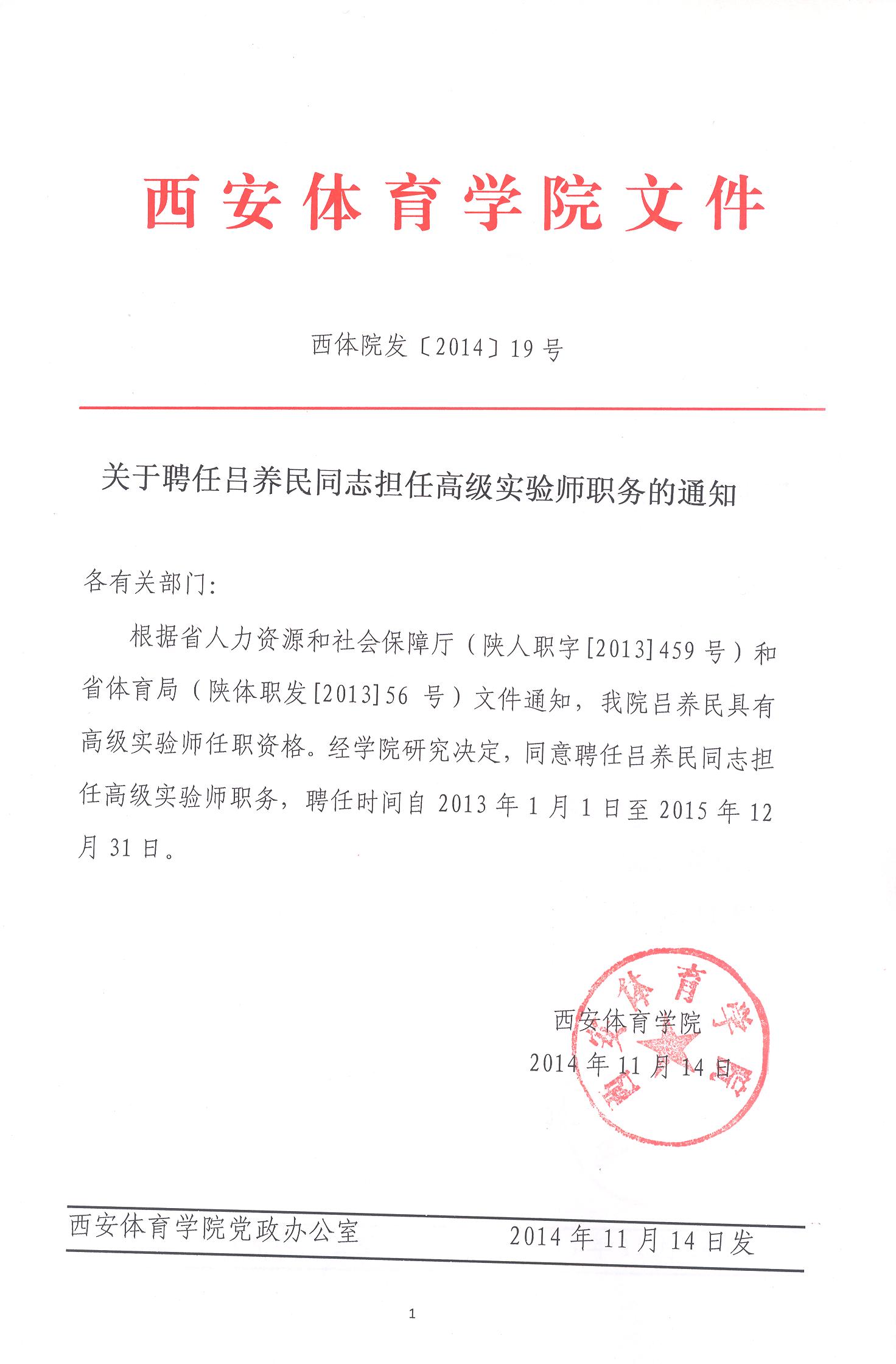 关于聘任吕养民同志担任高级实验师职务的通知