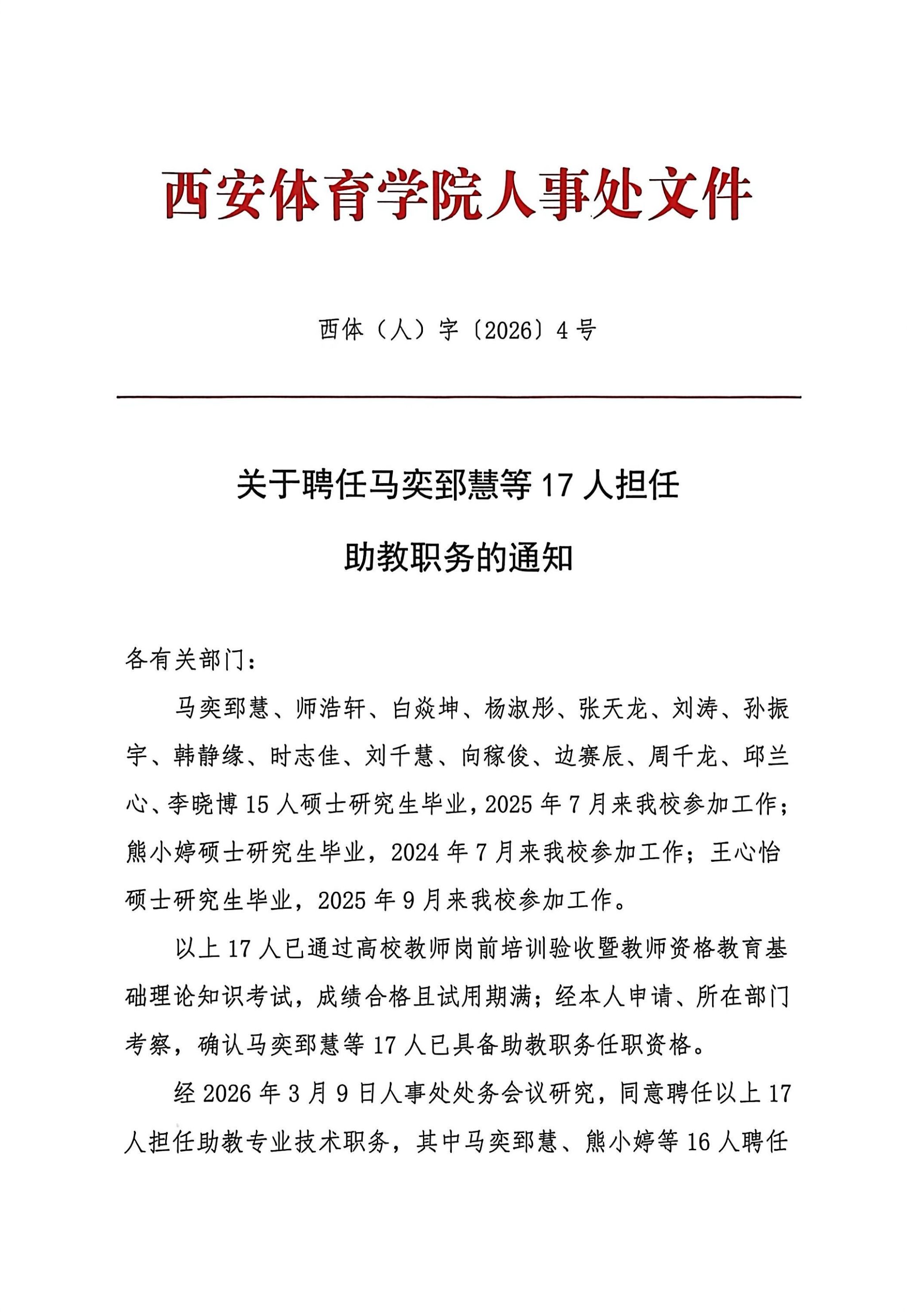 关于聘任马奕郅慧等17人担任助教职务的通知