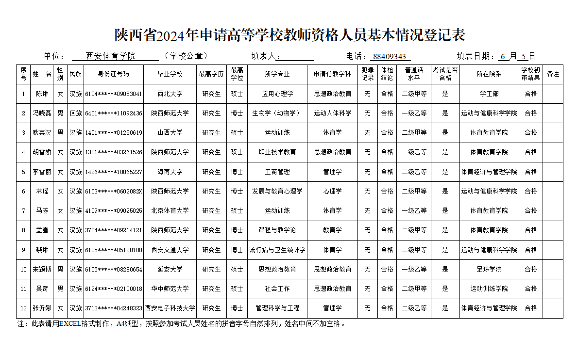 根据《陕西省教育厅办公室 关于做好2024年全省高等学校教师资格专业技能考试与认定工作的通知》(陕教师办〔2024〕7 号)要求,现将我校参加2023年教师资格教育基础理论知识考试合格,符合陕西省2024年申请高等学校教师资格人员基本情况予以公示,公示期5个工作日(2024年6月6日-2024年6月13日,如有异议,请于2024年6月13日前向人事处或校纪检监察部门客观如实地反映公示对象的情况。