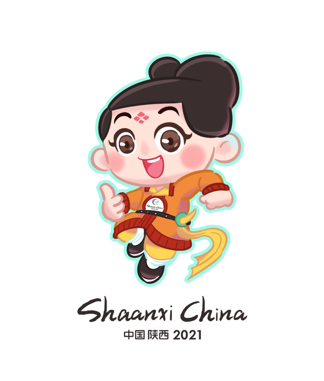 吉祥物“安安”取意唐代打马球俑。“安安”整体造型突显唐俑特色,体现陕西厚重的历史文化底蕴和盛唐开放包容的气象。黄色丝绸飘带代表丝路起点迎盛会,三秦儿女喜庆盛会。