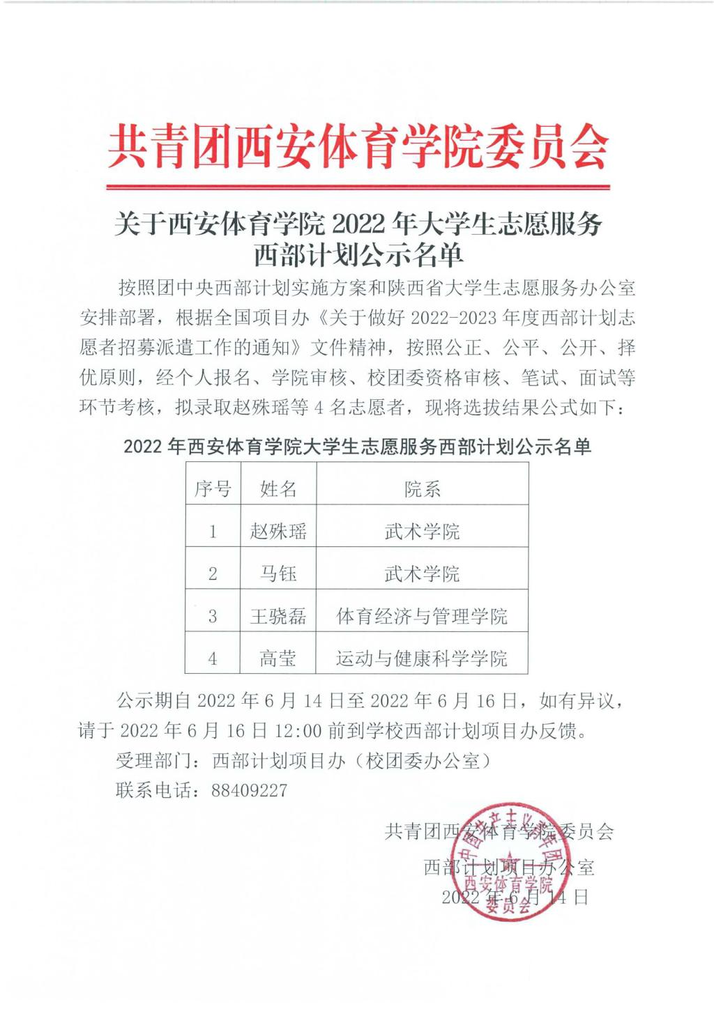 关于西安体育学院2022年大学生志愿服务西部计划公示名单