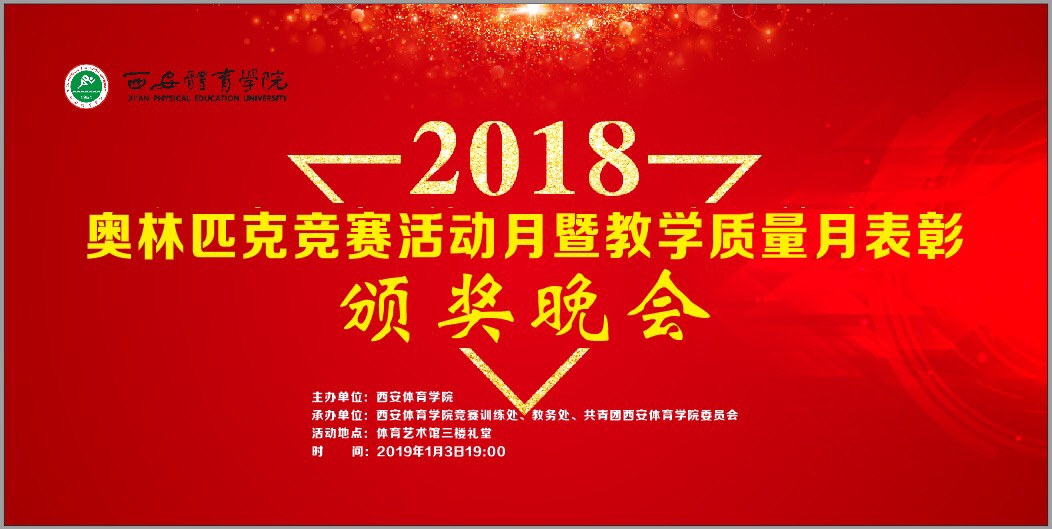 2018年转瞬即逝,2019年宛若新生。本学期也接近尾声,我们即将迎来由西安体育学院主办,西安体育学院竞赛训练处,教务处,共青团西安体育学院委员会承办的“2018年奥林匹克竞赛活动月暨教学质量月表彰颁奖晚会”,本次晚会将于2019年1月3日19:00在学校体育艺术馆三楼礼堂举行,期待你们的到来!