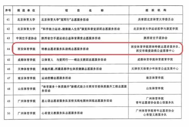2023年9月,国家体育总局印发《关于开展2023年全民健身志愿服务优秀案例征集活动的通知》,各地各单位积极响应,报送了一批扎根基层、服务群众的全民健身志愿服务案例。经申报审核、专家评审、社会公示等环节,最终遴选出50个工作成效好、示范作用强的优秀案例。其中我校报送的“特教志愿者服务队助残志愿服务活动”获得全民健身志愿服务优秀案例。