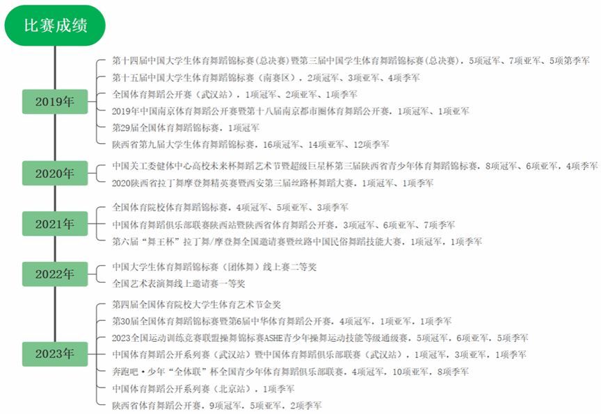 本课程从2006年开课至今已经历16年的教学实施过程,在200820122016201820202022年分别进行了6次培养方案的修订及教学大纲的重新编撰。先后被授予“优秀教学团队”;“校级精品课程”;“校级优质课程”;陕西省体育舞蹈(拉丁舞)运动后备人才培训基地;校级师德建设先进集体荣誉称号;国家教育部大学生体协体育舞蹈分会副主席单位;陕西省教育厅学生体协体育舞蹈专委会主任、秘书长单位;省级“一流课程”;舞蹈作品《弈》、《薪火》获得第三届、第四届全国体育院系学生体育艺术节金奖;多次获得全国及省级多项冠军。从单一的课堂教学,发展为融教学、训练、科研、创编、汇报展演、社会实践为一体的融合体系。