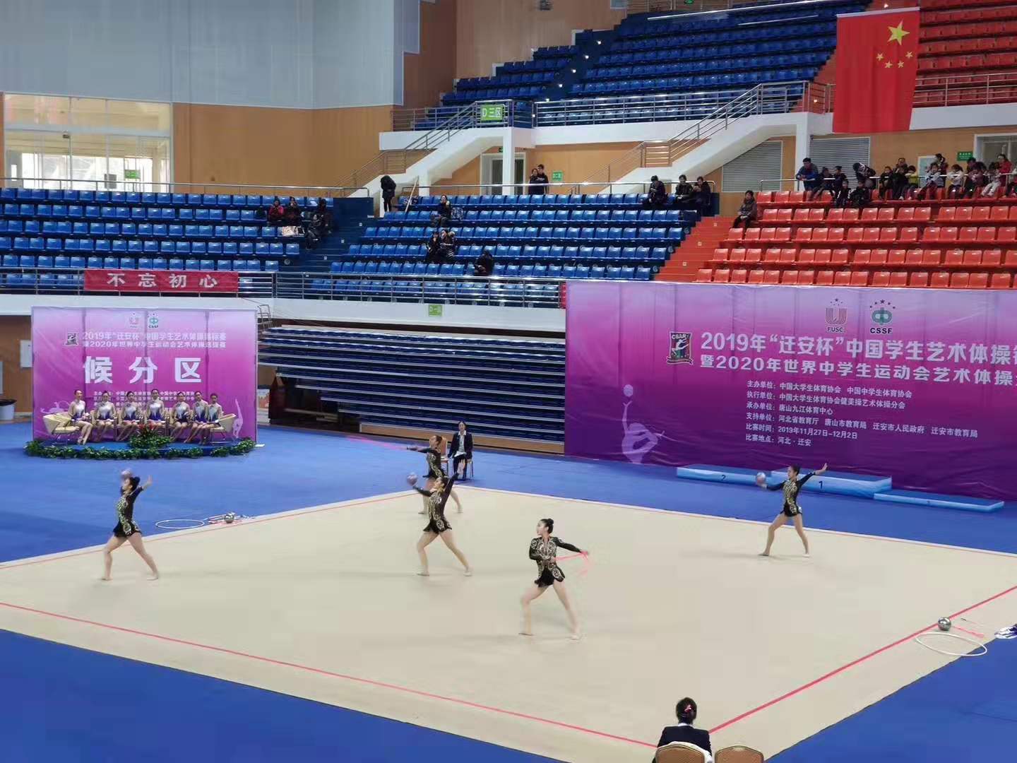 2019年11月27日-12月2日“中国学生艺术体操锦标赛暨2020年世界中国学生运动会艺术体操选拔赛”在河北迁安隆重开幕。本次大赛是由中国大学生体育协会、中国中学生体育协会主办,中国大学生健美操艺术体操分会执行,唐山九江体育中心承办的中国学生艺术体操最高级别的赛事,共有来自全国78所大、中、小学,共计785名运动员参加的本次大赛。西安体育学院艺术体操队在本次大赛中凭借团队默契的合作、精准的配合,完美的表演,一举夺得体育院校A组集体全能冠军、三球二绳冠军、艺术集体操冠军、六级带操冠军、六级徒手亚军以及团体总分第三名的优异成绩。