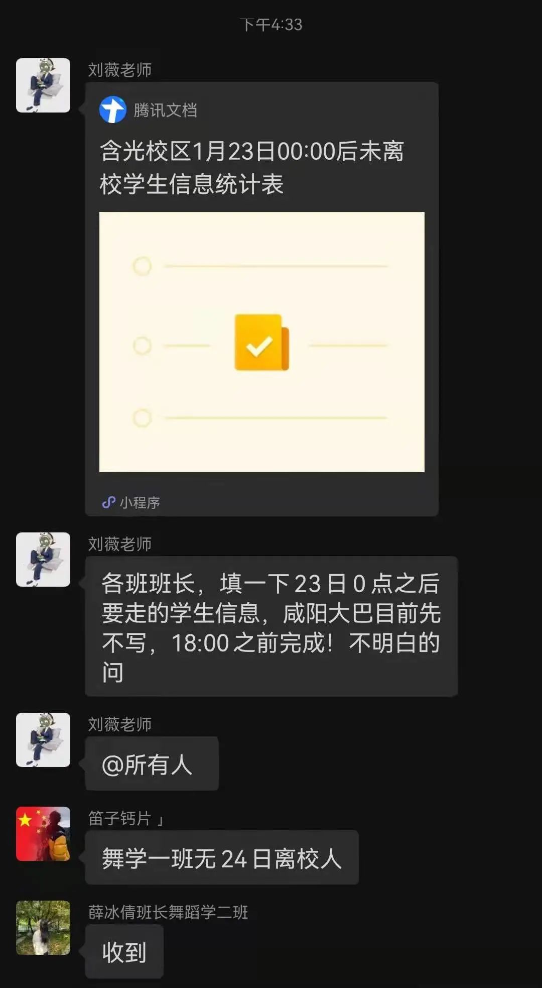 艺术学院学工办主任黄宏叶,副主任刘薇线上积极部署,面对学生不同的出行需求,精确做好学生的去向信息摸排统计,确保每一位学生顺利返乡。辅导员赵静雯、车栋,全力配合工作方案,尽职尽责保证把每一位学生按时按点送到指定位置。