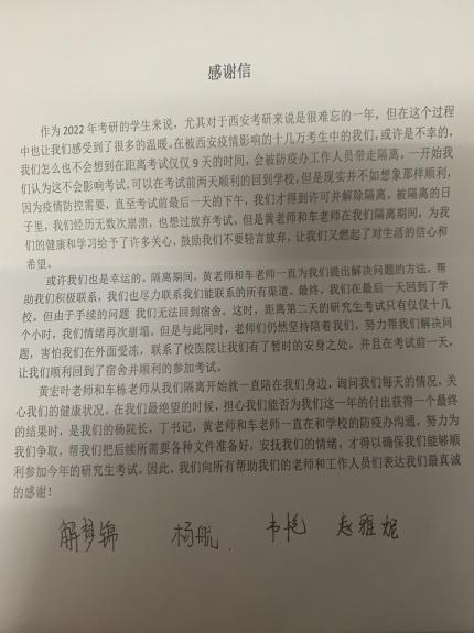 由于突发情况,被隔离的考生担心无法正常考试从而产生了不稳定情绪,为了不让即将考研的同学分心,不让被隔离的学生情绪失控,艺术学院两位辅导员老师第一时间了解学生情况并进行心理疏导,四名学生两位老师通话数小时,竭尽所能帮助这四名同学,因为事发时黄宏叶老师小区被封控管理了,他人出不去但心早就飞到了学生身边。黄老师通过视频电话的方式与学生取得联系,了解学生情绪,安顿学生隔离事宜。通过线上的方式全力配合碑林区防疫办对学生进行隔离防控安排。与此同时车栋老师则对这四名考生进行心理疏导、安抚,积极帮助同学们稳定情绪。老师们不辞辛苦的落实学生每日的情况,只为确保学生健康、安全,时间过得很快,四名学生隔离即将结束,同时也到了研究生考试的日子,这四名同学均参加了今年的研究生考试,其中一名学生报考了校外的学校。在考试当天黄宏叶老师与车栋老师为了学生能顺利参加这场考试,他们落实工作到凌晨两三点钟,终于在他们周密的协调下学生们顺利的进入了考场。赶考当天,艺术学院刘强副院长和车栋老师于早上六点、六点半冒着大雪分批次护送学生顺利出行、抵达考场。在此之前由于四位考生的解除隔离通知单没有下发,黄老师一边线上心理疏导学生情绪一边对接研究生部与防疫办,给学生们争取到了单独隔离考场的安排。同时还积极协调三级防疫办为学生争取考前拿到解除隔离的通知单而努力。可谓是功夫不负有心人,终于在考研当日凌晨同学们收到解除隔离通知单,于是再次联系相关部门,确保学生正常参加考试。考试结束之后,两位老师落实考生安全等问题,并强调抓紧做核酸为第二天的考试做准备。最后,在参与本次工作协调的丁书记、杨院长的带领下,校医院、公寓办、研究生部老师们的支持与协调下最终使得这四名学生顺利的完成了此次研究生考试。另一边因疫情形势严峻,校团委需要各二级学院支援,黄宏叶老师又立刻投身于艺术学院志愿者服务队的志愿筹备工作,鼓励艺术学院学生积极报名,组成艺术学院团委志愿者服务队,为学校送去艺术学院的一份抗疫力量。