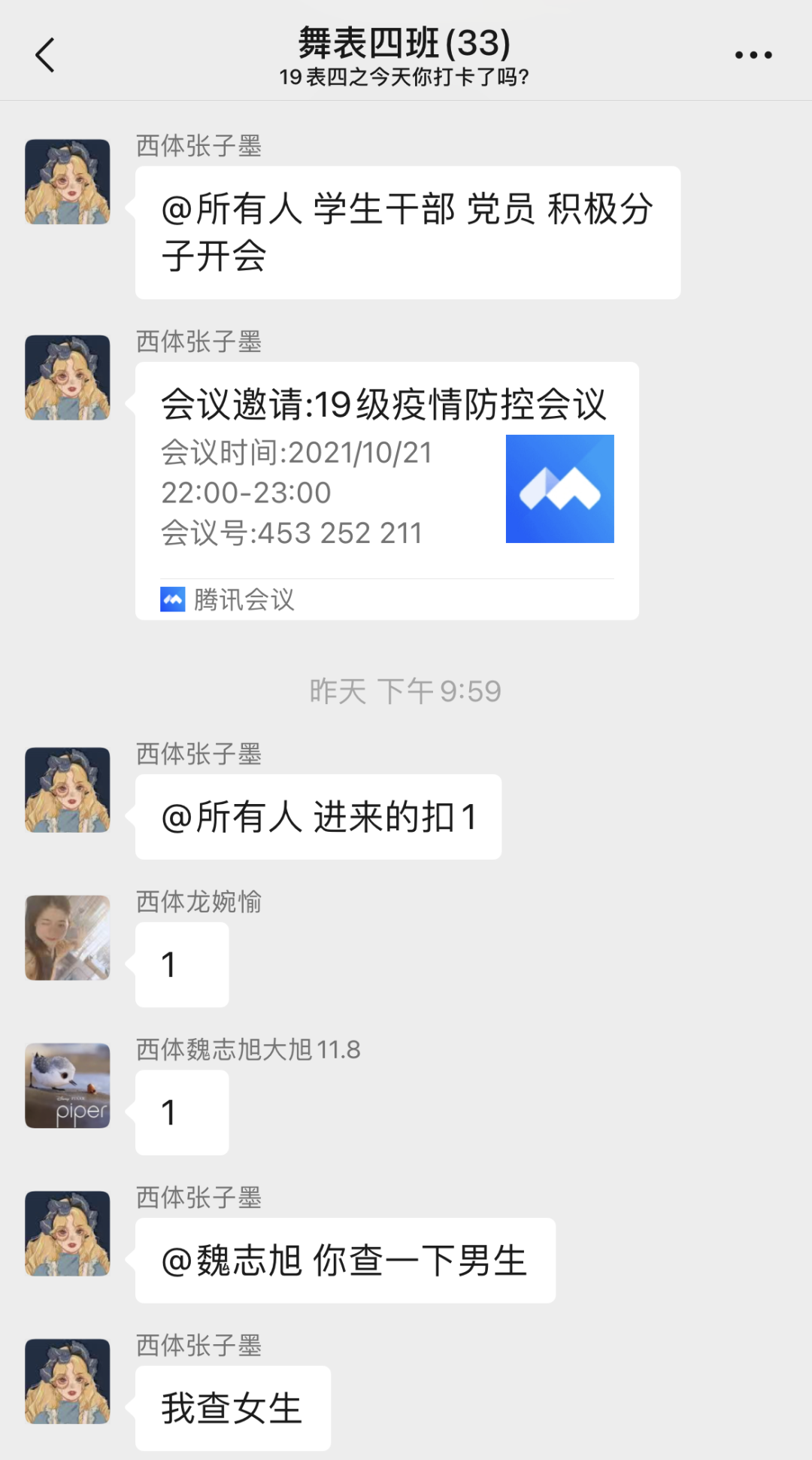 10月21日晚,艺术学院2019级师生通过软件进行疫情防控专题线上会议,会议由2019级辅导员赵静雯主持,全体学生干部、党员、入党积极分子参与会议。