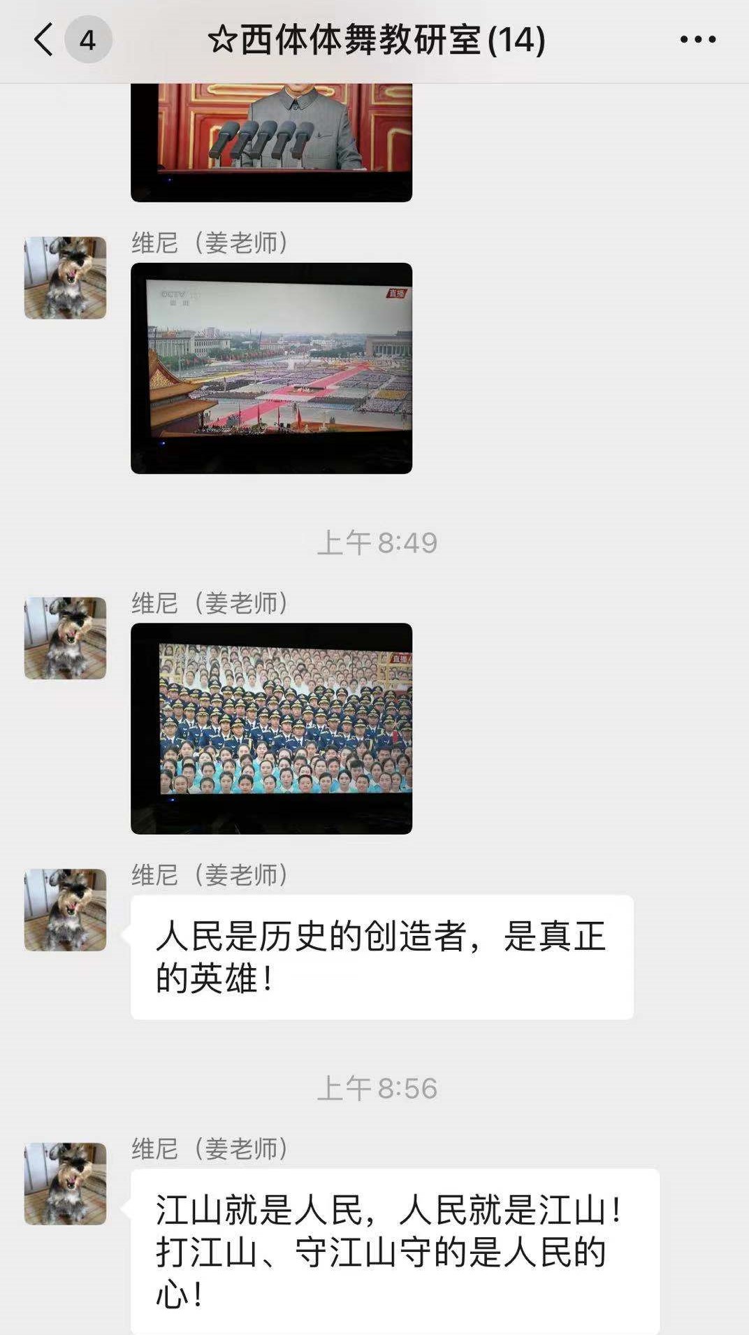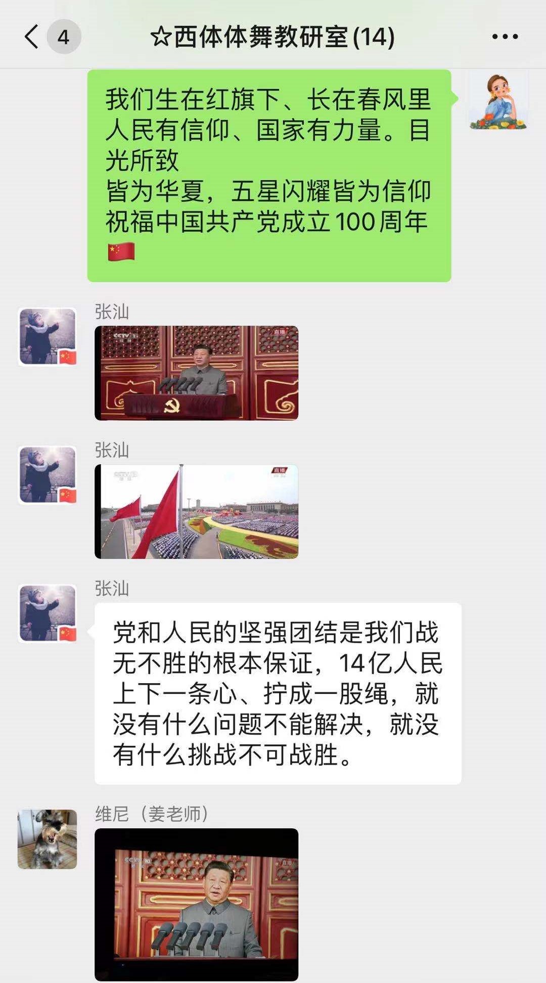 舞蹈教研室党支部书记李晓梅:以史为鉴, 必须坚持中国共产党的领导, 团结中华人民共和国全体人民,开创未来,走向伟大复兴!今天,中国共产党已经发展成为一个走过百年光辉历程、在最大的社会主义国家执政70多年、拥有9100多万党员的世界上最大的马克思主义执政党,得到了14亿中国人民最广泛的支持和拥护。中国共产党立志于中华民族千秋伟业,百年恰是风华正茂!我们要认真回顾走过的路,不能忘记来时的路,继续走好前行的路,坚定理想信念,牢记初心使命,植根人民群众,始终保持蓬勃朝气、昂扬斗志。只要我们党始终站在时代潮流最前列、站在攻坚克难最前沿、站在最广大人民之中,就必将永远立于不败之地。