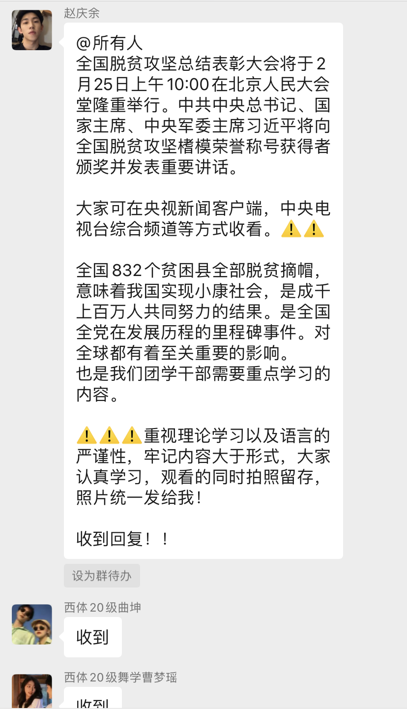 2021年2月25日艺术学院积极组织各个年级、班级、学生干部及全体学生党员在线观看“全国脱贫攻坚总结表彰大会”。