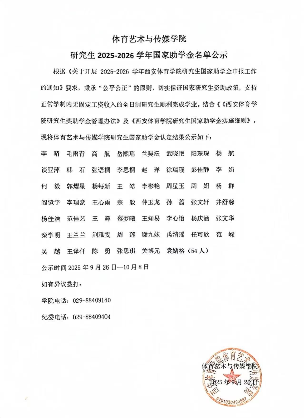 体育艺术与传媒学院 研究生2025-2026学年国家助学金名单公示
