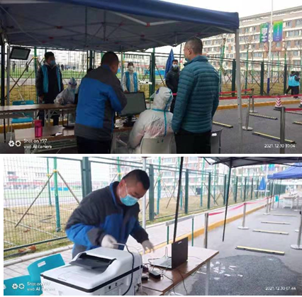 鄠邑校区,王爽副主任和司涛同志每天清晨便开始奔走于东西校区各核酸检测点,随时待命做好网络检查和调试,确保鄠邑校区师生核酸检测和防疫工作的顺利进行。