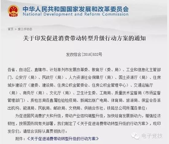 2016年4月15日,为促进居民消费扩大和升级,带动产业结构调整升级,加快培育发展新动力,增强经济韧性,按照国务院有关部署,国家发改委制定了《关于促进消费带动转型升级的行动方案的通知》,其中第七项 教育文化信息消费创新行动中更是提到鼓励电子竞技发展。