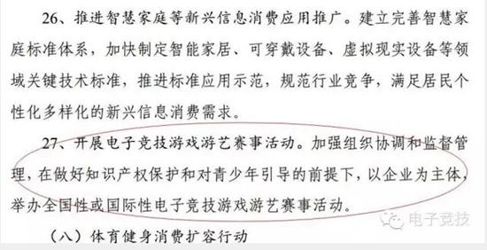 第七大项27条中提到“开展电子竞技游戏游艺赛事活动”,加强组织协调和监督管理,在做好知识产权保护和对青少年引 导的前提下, 以企业为主体,举办全国性或国际性电子竞技游戏游艺赛事活动。