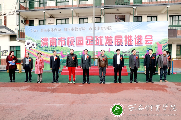 本网讯 3月21日上午,由渭南市体育局、渭南市教育局和我院共同主办,渭南临渭区教育局、北塘实验小学协办的“渭南市校园足球发展推进会”启动仪式在渭南北塘实验小学举行。我院副院长文立新、足球改革发展办公室主任朱军、足球教研室主任唐铁峰、足球教研室教师孙航、胡鑫带领20余名足球专项学生参加了本次活动。