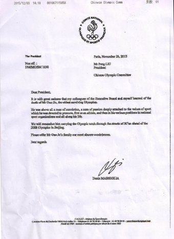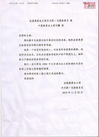 法国奥委会主席丹尼斯•马瑟格里亚致函吊唁郭洁教授【图】