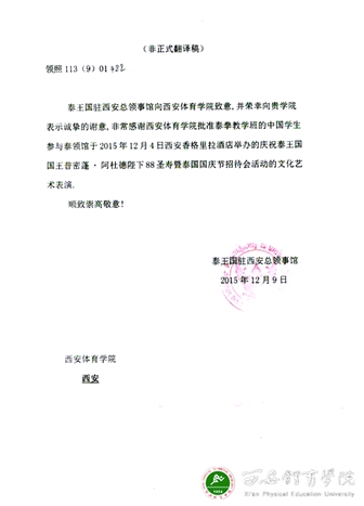 12月4日,泰国驻西安领事馆举办了庆祝泰国国王生日暨泰国国庆日活动,我院学生应邀参加了泰拳艺术表演活动,此次活动圆满成功,泰王国驻西安领事馆专门发来感谢信,表达了对我院的感谢。