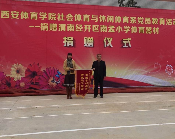 南孟小学校长给社会体育与休闲体育系赠锦旗