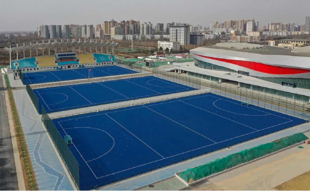 西安体育学院鄠邑校区“一馆四场”位于鄠邑新区东城南路两侧,北起吕公路,西起规划路,东至潭峪河。项目整体包含手球馆一座、曲棍球、棒球、垒球、橄榄球比赛场地共10块(含附属看台),以及配套的配电中心、污水处理、道路、景观绿化、信息化网络、运动员公寓、食堂等,总建筑面积约49万平方米。