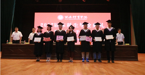 典礼在庄严地国歌声中拉开了序幕。副院长刘新民宣读了《关于授予2017届普通本科毕业生学士学位的决定》,由院长朱元利同志为毕业生代表拨穗并颁发学位证。副院长陈彦宣读《关于2017届院级优秀毕业生的表彰决定》,由全体院领导为院级优秀毕业生代表颁发证书及奖金。接着,党委书记吴长龄同志为赴新疆、西藏边远地区工作毕业生佩戴红花并颁发奖金。来自2017届运动训练系的连磊作为学生代表发言。发言中对领导老师的辛勤培养表示衷心的感谢,也讲出了自己即将走向社会要努力拼搏的志向,字里行间亦流露出对即将离开母校的留恋之情。来自体育教育系的高可心作为在校生代表发言时,对学长学姐的顺利毕业表示衷心的祝贺,感谢学长学姐在校时对低年级学生的帮助,也为即将离开学校步入社会的学长学姐送上了真切的祝福,希望他们能乘风破浪,成为学校的骄傲。来自体育艺术系的教师代表魏明涛致辞时为毕业生送上祝福,在热烈的掌声中,魏老师回忆了学生匆匆逝去的四年时光,也希望他们能放飞梦想,大胆的去追求属于自己的美好明天。健康科学系毕业生家长代表张小娟女士致辞时,为毕业生悉心叮嘱,不管毕业后走到哪里都要不忘师恩,不忘母校。在致辞结尾她为毕业生送上了自己的祝福,也代表家长们对西安体育学院给予孩子们的培养表示感谢。