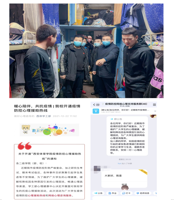做好服务保障,确保人文关怀到位。一是加强学工干部走访学生公寓、辅导员夜间值班制度,确保掌握关键时期学生的学习生活、思想心理动态变化,及时收集反馈、协调解决学生实际困难。二是做好疫情防控期间学生心理疏导与援助,学生工作部(处)心理健康中心及时开通“暖心陪伴,共抗疫情”——疫情防控心理援助热线和网络咨询服务,专兼职心理咨询师全天守护,为疫情当下出现的恐惧、焦虑等不良情绪的学生做好了情绪疏导和暖心服务,截止目前接待网络心理求助7例,其中教师1人,学生6人。三是做好疫情防控期间学生日常服务工作,例如贫困学生助学金、退役士兵教育资助金的统计与发放工作,发布2021年普通话水平测试暂缓的通知等,确保疫情期间学生服务不掉队。
