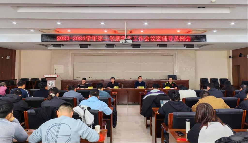 2024年是我校“十四五规划”和“三年行动计划”的关键一年,踏着“百日奋战”工作基石,接续奋斗,砥砺前行。2月24日下午,在二号行政楼6楼报告厅召开我校2023-2024学年第二学期学生工作会议暨辅导员例会,全体专兼职辅导员及学工部全体人员、校团委负责人参加本次会议,会议由学工部部长王志刚主持。