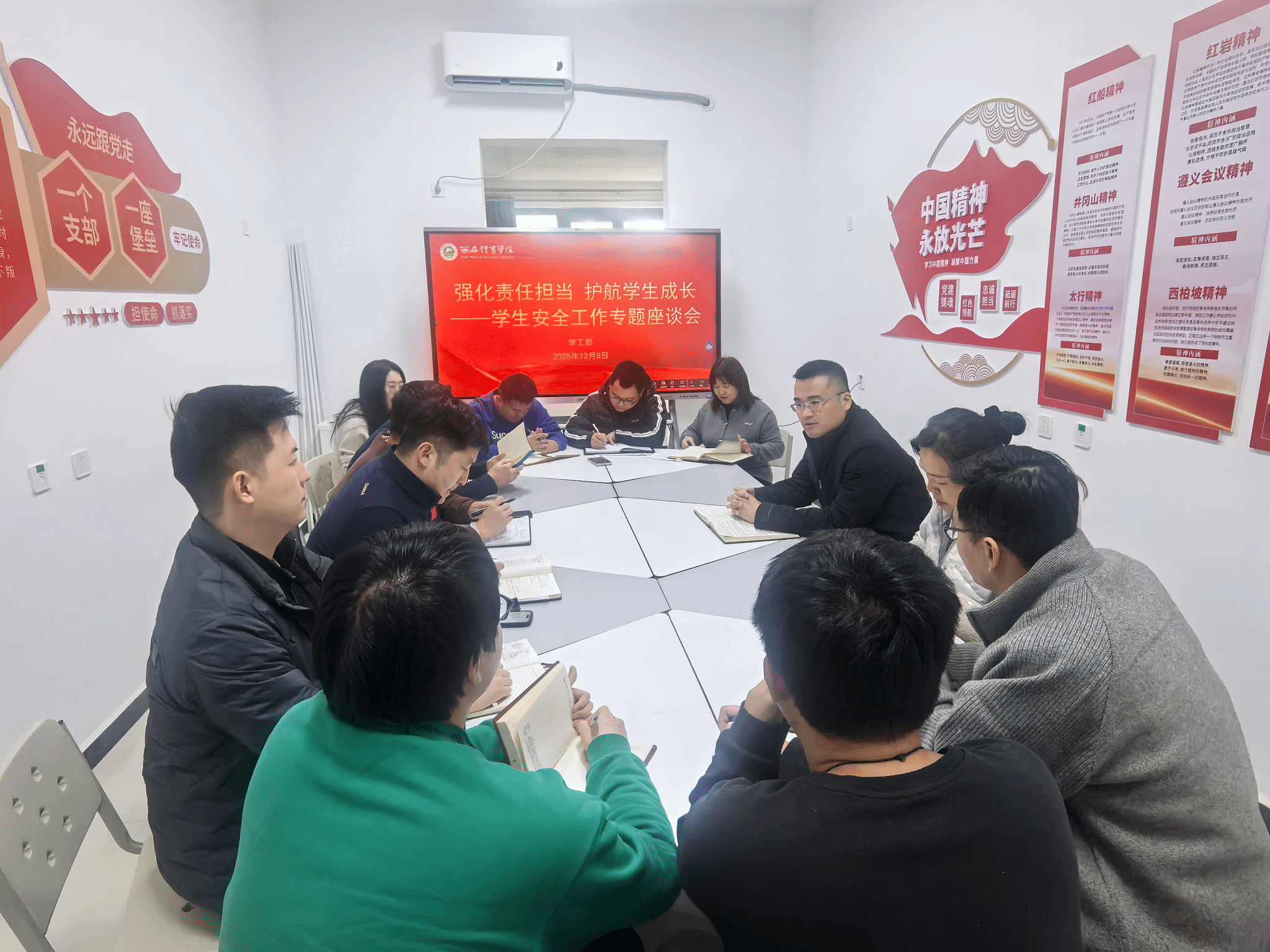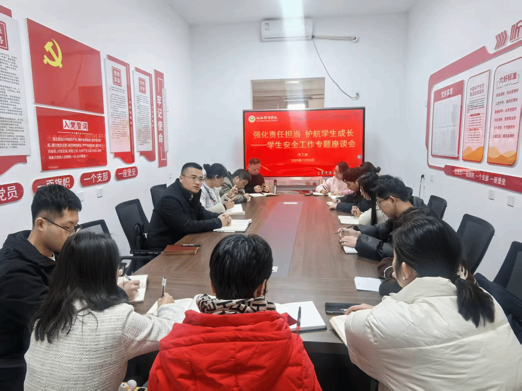 为进一步筑牢校园安全防线,强化学生安全管理工作,129日,学工部在鄠邑校区一站式学生社区组织召开学生安全工作专项座谈会。学工部部长马国华、副部长王青及思想教育科谢千前往一站式学生社区党团活动室,与各楼宇辅导员开展“分楼宇、面对面”座谈,围绕重点安全领域进行深入座谈交流。