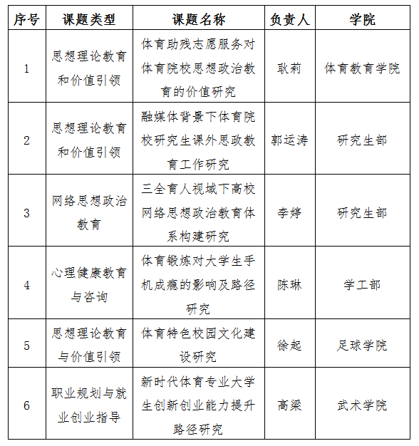 根据《中共西安体育学院党委学生工作部关于申报2024年度学生工作专项研究课题和精品项目的通知》的要求,学工部组织专家对所申报项精品项目和专项研究课题进行了公开、公正、公平的评审,决定立项2项精品项目、6项专项研究课题,现予以公示,具体名单如下: