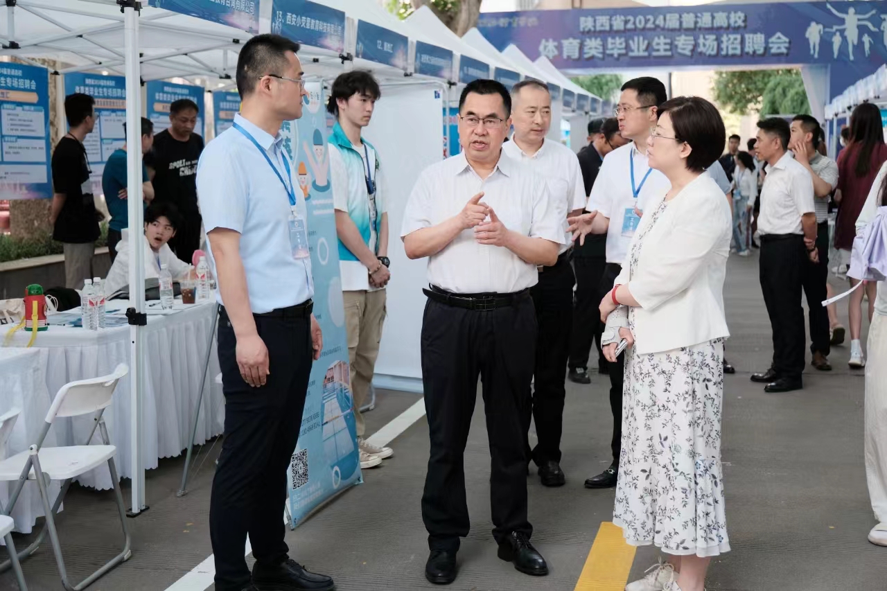 本网讯 为助力陕西省体育类毕业生高质量就业,陕西省2024届普通高校体育类毕业生专场招聘会于5月18日在我校含光校区举行。党委书记刘子实、校长李富生、副校长张卫国、陕西省教育厅、陕西省团省委相关部门负责人到场详细了解参会单位用人需求情况,指导和鼓励毕业生就业。