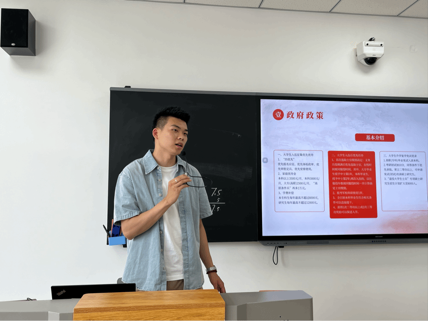 宣讲会上, 宋峙谚围绕 “政府政策、学校帮扶、入伍准备、退伍优待、浅谈军旅” 五大板块展开分享。解读政府政策时,聚焦大学生入伍 “四优先” 体检政审、国家资助体系,清晰梳理学费补偿、优抚金发放等 “福利清单”,让政策红利直达学生;谈及学校帮扶,从学业衔接规划到就业指导支持,为学生扫清参军 “后顾之忧” 。