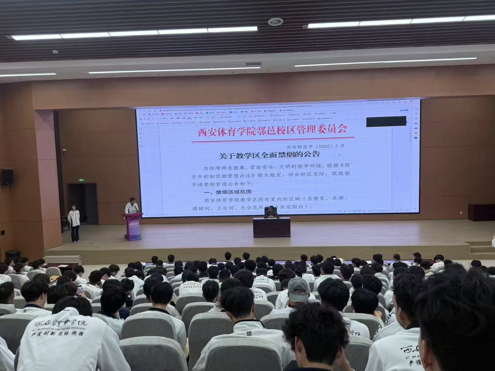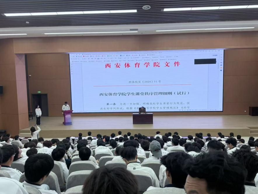 会议伊始,由年级纪律负责人体育教育专业2023级2班潘俊言进行考勤汇报。接下来,潘俊言带领全体同学领学《关于进一步加强学生管理工作的通知》;3班班长何炳坤、10班班长李文昊、11班班长杨菲雨带领全体同学领学《西安体育学院学生违纪处分规定》;2班纪律委员张宇晨带领全体同学领学《西安体育学院学生课堂秩序管理细则》。3班王培明同学在会上做出禁烟表态并领学《关于教学区全面禁烟的公告》,通过文件的学习,同学们更加明确制度不仅是约束,更是成长的保障,让我们从日常细节做起,养成教育,将纪律内化于心,外化于行共建成长进步的和谐美好校园。