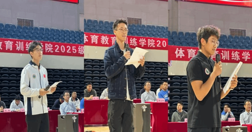 教师代表谢宜轩老师和硕士导师代表张亮亮老师先后发言。他们从为师者的角度,分享了对教书育人的感悟,表达了对新同学的殷切期望,承诺将竭尽所能为学生的成长成才保驾护航。紧接着,2025级运动训练专业的本科及研究生新生代表分别发言,他们抒发了初入校园的激动与憧憬,表达了刻苦学习、为院争光的决心。2024级体育教育专业的老生代表也分享了在校一年的学习生活经验,为学弟学妹们提供了宝贵的建议。