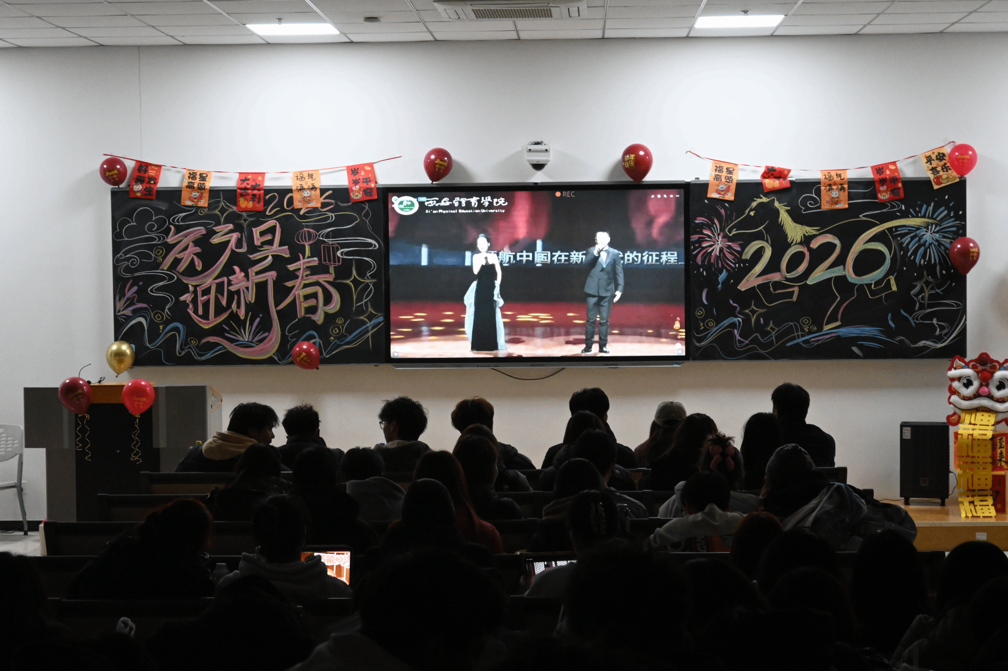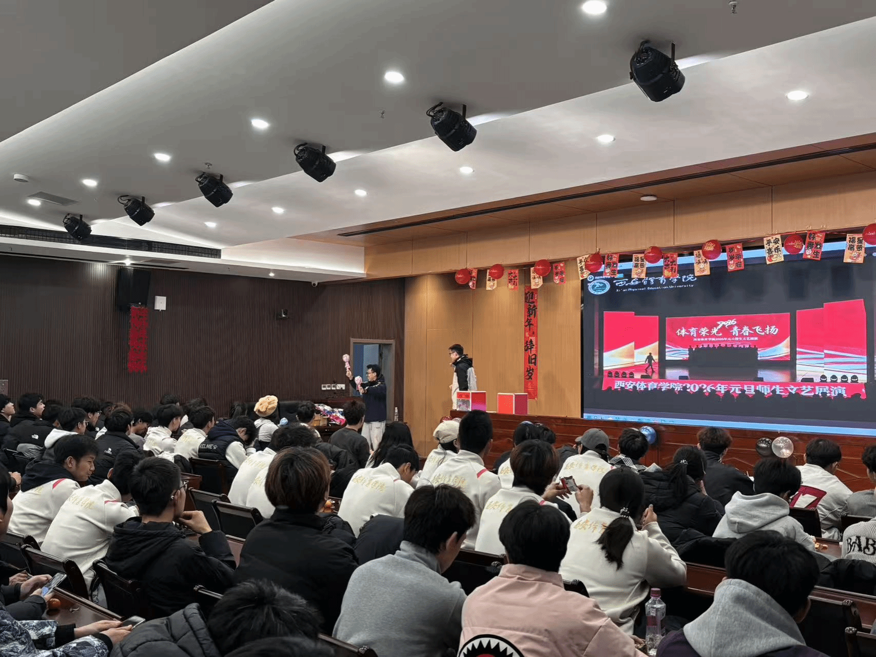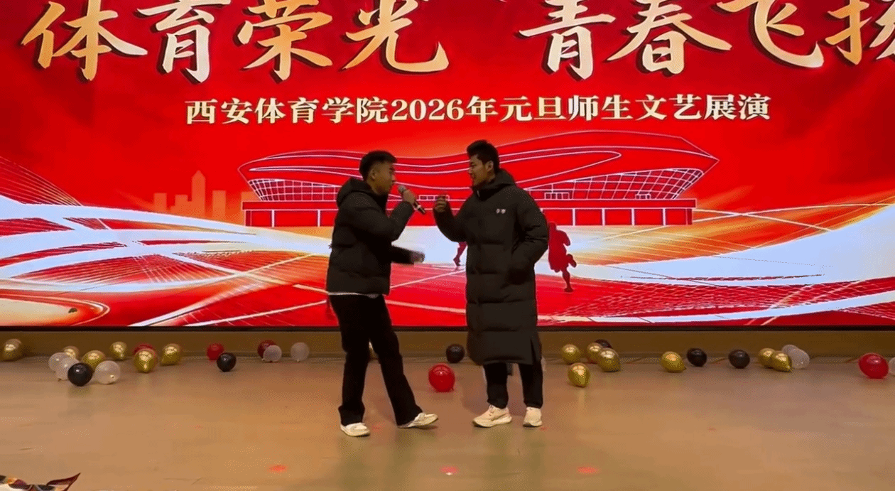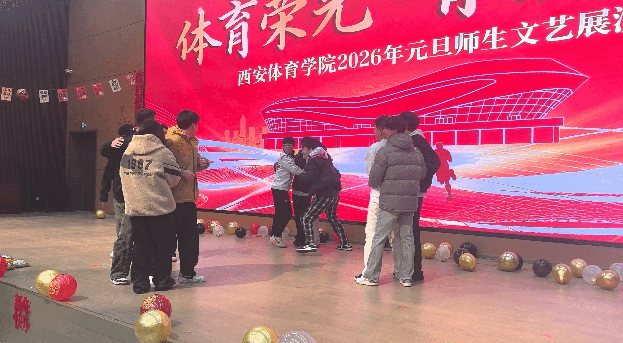 为喜迎2026年元旦,营造团结奋进、温馨向上的校园文化氛围,2025年12月31日晚,西安体育学院含光校区艺术馆内“体育荣光 青春飞扬”2026年元旦师生文艺展演隆重启幕。体育教育训练学院在鄠邑校区设立分会场,与主会场实时联动、隔空共鸣,共同呈现了一场形式丰富多元、气氛热烈高涨的元旦联欢活动,尽显学院师生昂扬向上的精神风貌与深厚的集体凝聚力。