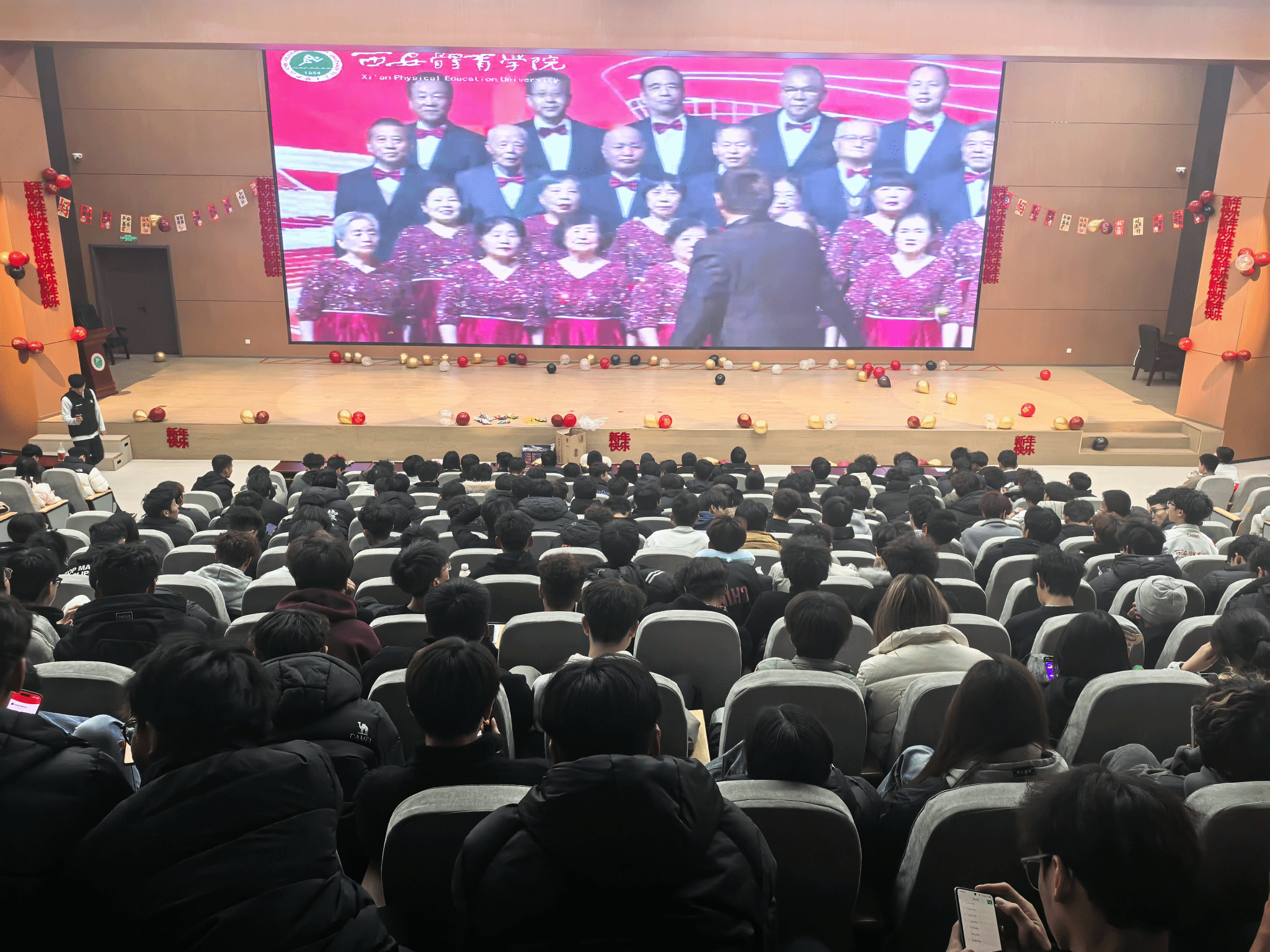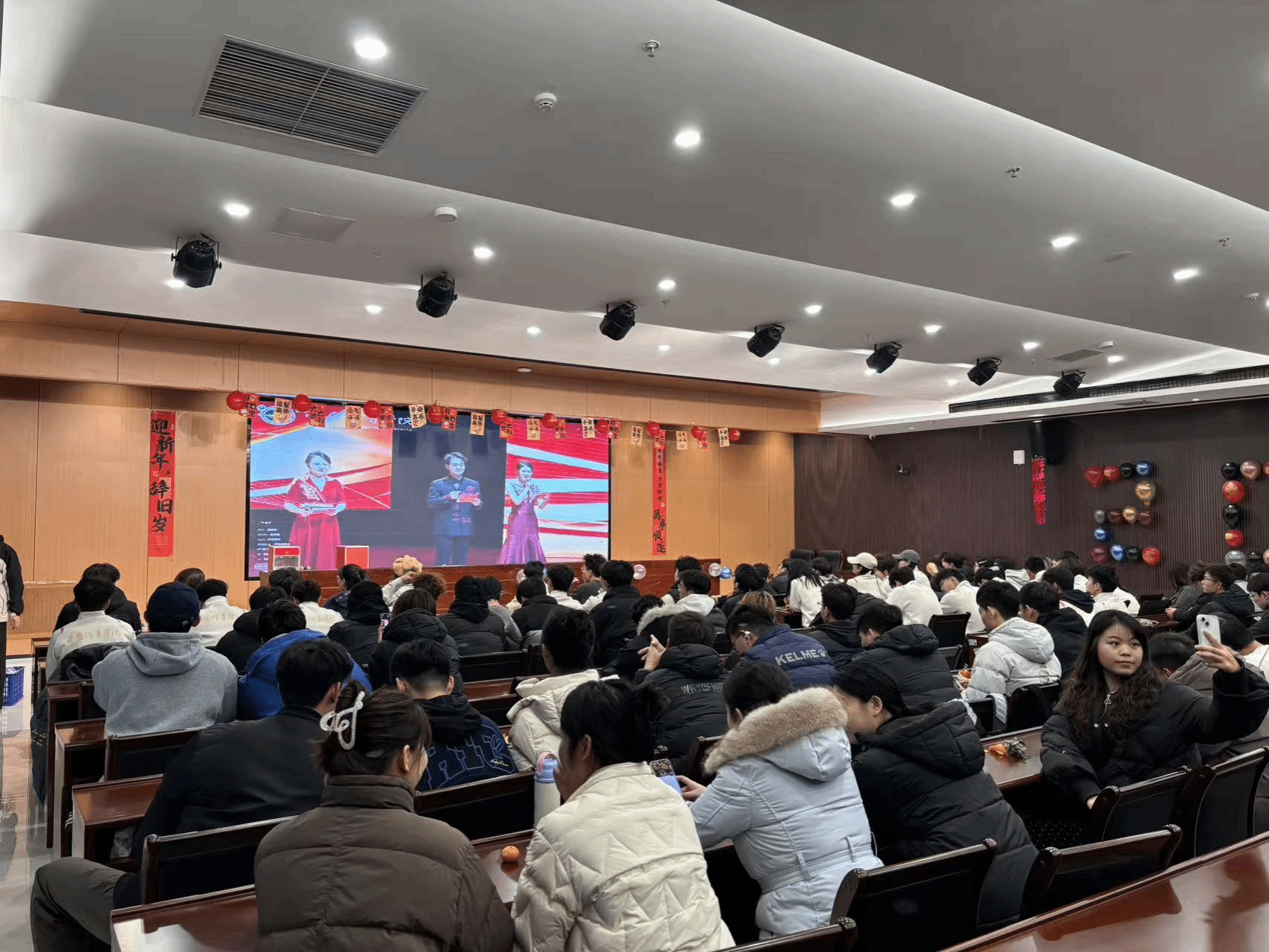 当晚19时30分,活动在欢声笑语中拉开帷幕。鄠邑校区分会场内,学院各专业辅导员与学生欢聚一堂,通过视频直播共同观看含光校区主会场的精彩演出。掌声、笑声、欢呼声交织回荡,此起彼伏,两地学子在节日的喜悦中情感相连、心意相通。