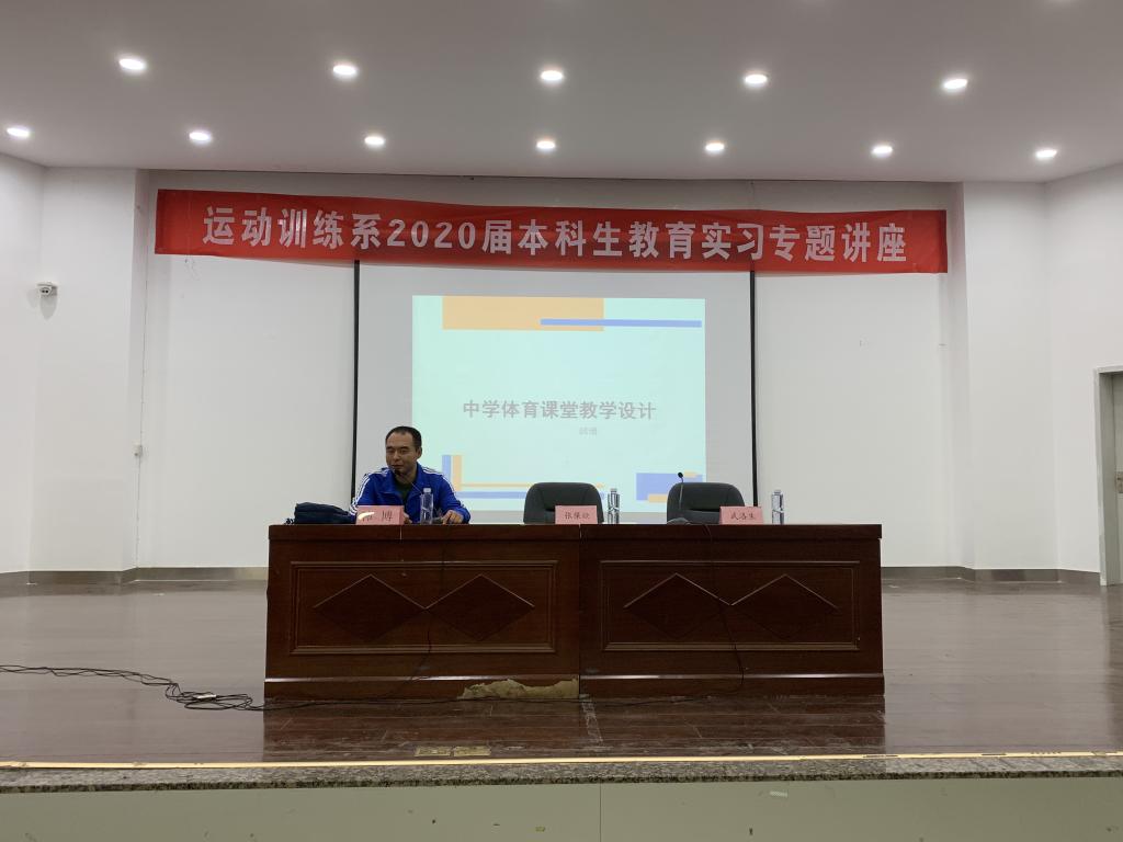 5月15日下午,运动训练系邀请国家级田径裁判,“全国十佳活力园丁”、“陕西好青年”陕西省中小学体育名师西安市第一中学韩博老师,在教学楼五楼报告厅为运动训练系2016级的全体学生作了《中学体育课堂教学设计》专题报告。会议由运动训练系副主任武洛生主持,参加会议的有运动训练系主任张葆欣、校内实习指导老师、年级辅导员以及2020届全体学生。