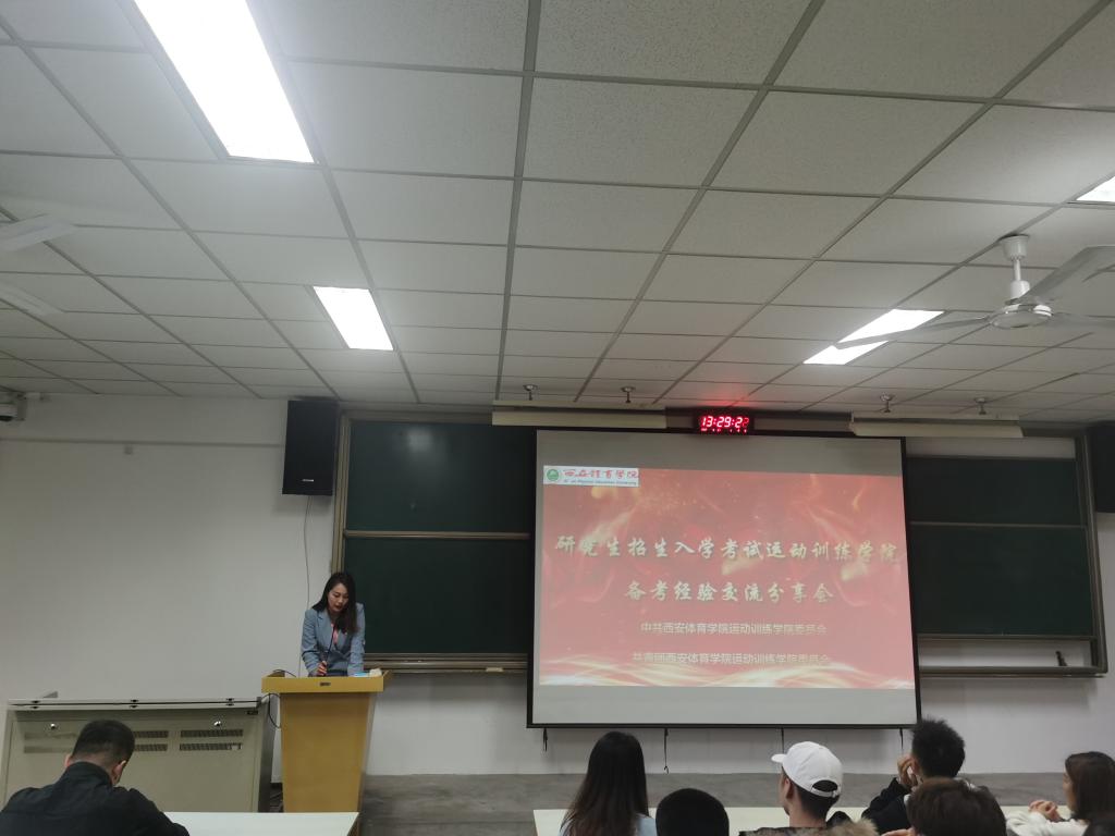 谢宜轩博士作为运动训练学教研室党支部书记一直为学院本科生带运动训练学专业课,为历届学生成功考研立下汗马功劳!本次分享会谢老师通过风趣幽默的语言快、狠、准地瞄准中每一位预备考研学生的具体情况,做了充分分析,对大家提出了备考的方法及考研学习时间的分配等具体要求,同时叮嘱备考学生借鉴学长们考研经验,根据自己自身学习水平,掌握科学的复习方法,及时调整心态,为了自己的目标与理想拼搏奋斗。