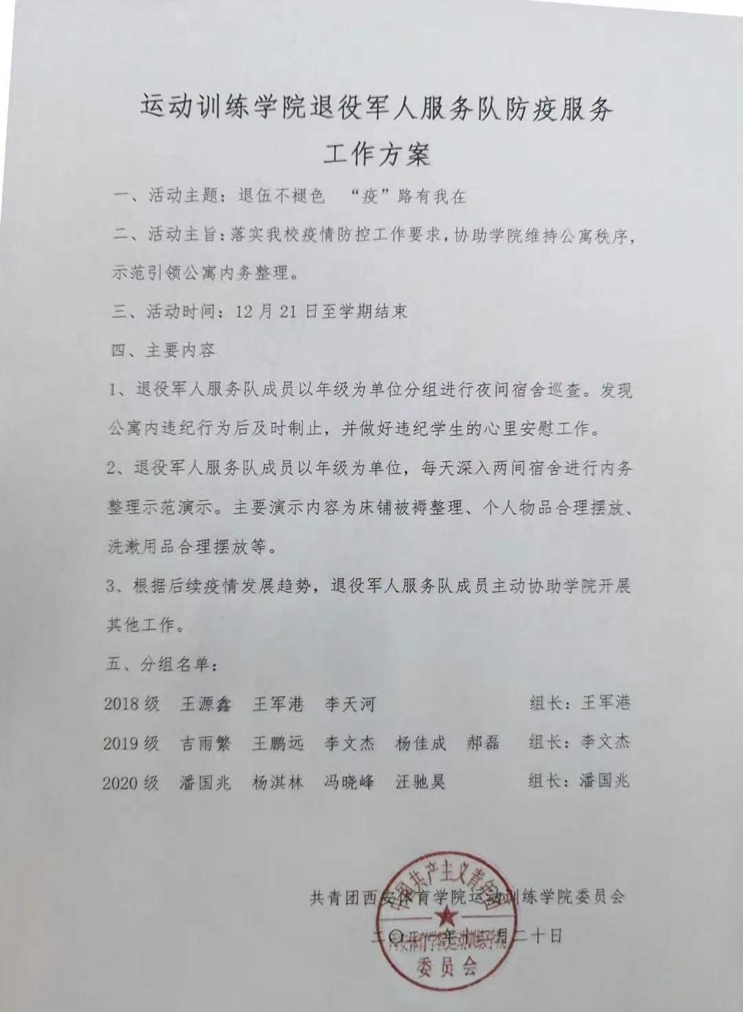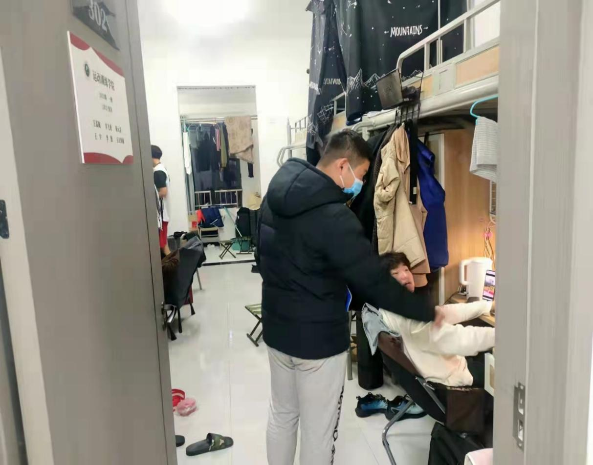 面对突如其来的疫情,为了落实我校疫情防控工作要求,协助学院维持公寓秩序,示范引领公寓内务整理,运动训练学院还成立了以退伍复学学生为主体的退役军人志愿服务队。退役军人服务队每晚协助辅导员对宿舍环境卫生进行检查,指导学生宿舍的内务。