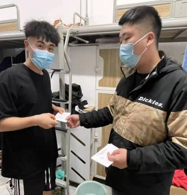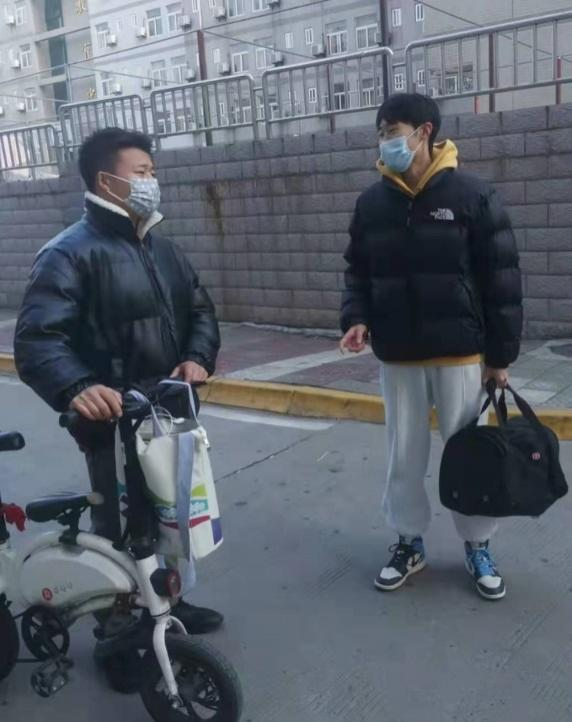 照片十四:年级主任张即帅、兼职辅导员南海涛给学生搬运发放校友捐赠防疫物资,带领党员先锋队维持核酸检测秩序