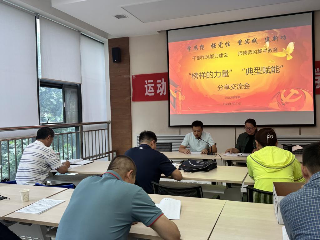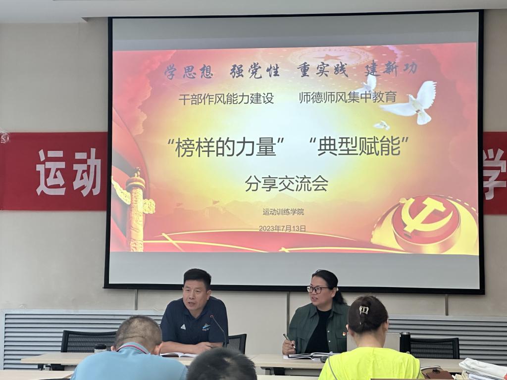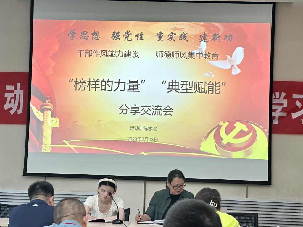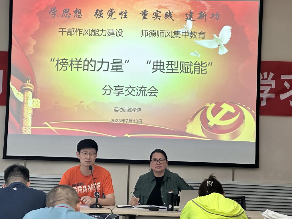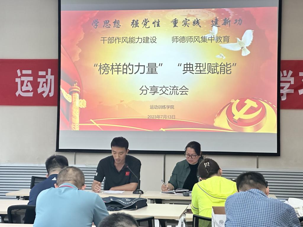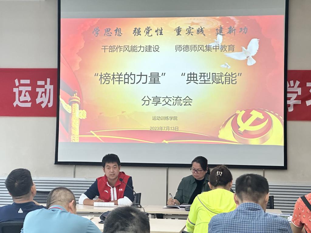 高山仰止,方知才疏,三人同行,觉左右为师。为深入学习贯彻习近平新时代中国特色社会主义思想,贯彻落实习近平总书记关于教育的重要论述、立德树人的根本任务,充分发挥教师的示范引领作用,更好加强师德师风建设,促进教师的专业养成,同时也为青年教师提供学习交流的机会。7月13日下午运动训练学院开展“榜样的力量”、“典型赋能”交流分享会。运动训练学院领导班子、全体教师出席了本次活动。会议由党委书记王鑫主持。