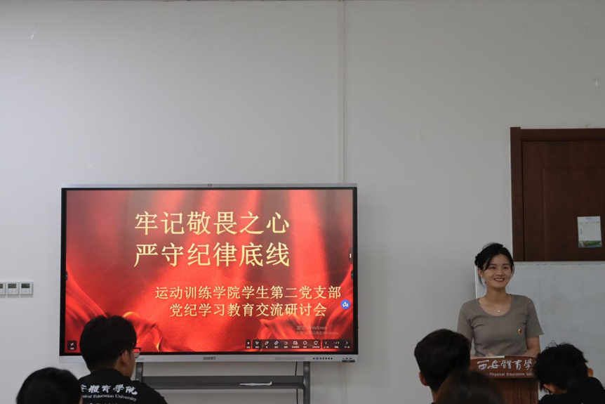 为进一步深入学习贯彻新修订《中国共产党纪律处分条例》,增强党员党性修养和纪律意识,加强入党积极分子培养教育,进一步增强党员纪律意识,规矩意识。6月24日下午,运动训练学院学生第二党支部在鄠邑校区橄榄球馆117教室召开“牢记敬畏之心 严守纪律底线”党纪学习教育交流研讨会。学生第二党支部负责人罗玄,全体入党积极分子参加了本次会议。
