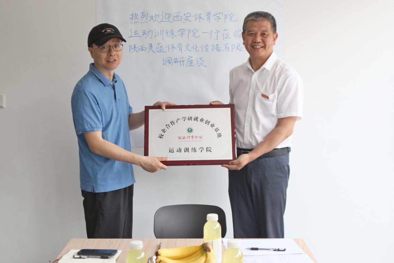 随后,举行了校企合作产学研就业创业基地授牌仪式。武洛生向陕西美蓝体育文化传播有限公司授牌,高月宏向陕西美蓝体育文化传播有限公司董事长王焱颁发校外导师聘书。这标志着运动训练学院与陕西美蓝体育文化传播有限公司正式建立校企合作,双方将在人才培养、实践教学、科学研究等方面展开全面合作。
