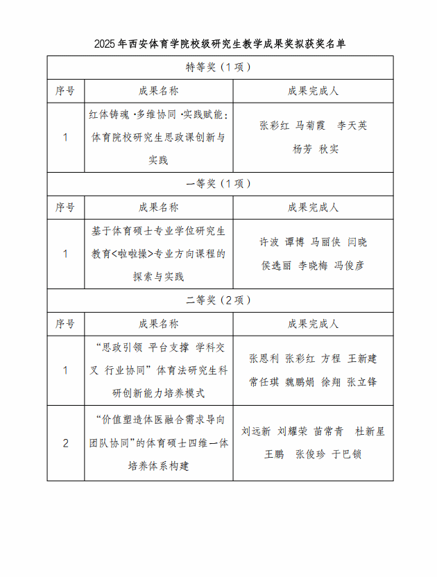 西安体育学院2025年校级研究生教育教学成果奖评审工作已 于近日完成,经项目负责人申报,各学院推荐,校外专家评审, 拟授奖成果 4 项,其中特等奖 1 项,一等奖 1 项,二等奖 2 项, 现予以公示。