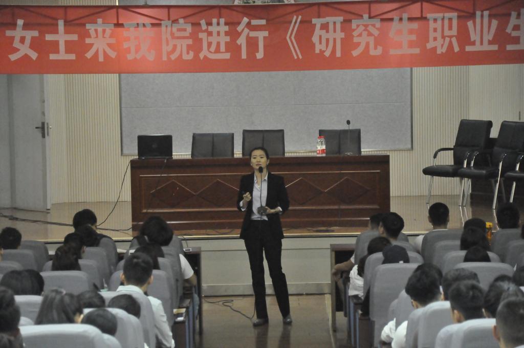 为指导我院研究生尽早开展职业规划,确立科学有效的学习目标,研究生部党总支邀请从事人力资源17年,曾于IBM,Google,戴姆勒(奔驰)等外资企业担任高管,并于大型民营、互联网、Google系创业公司担任人力资源高级副总裁、首席管理顾问等职位的姜瑞女士来我院为全体研究生进行《职业生涯规划》讲座。