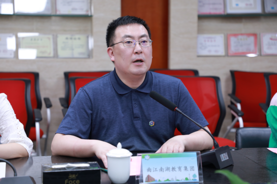 曲江南湖教育集团总校长穆怀宇对西安体育学院领导一行的到来表示热烈的欢迎,他从学校办学目标、办学理念、校园文化建设、教师队伍培养、学生发展和建校以来所取得的优异成绩等方面做了详细介绍。穆怀宇校长希望为西安体育学院研究生部学生发展搭建开放式就业实践平台,提供更多拓宽视野、感知社会、锻炼能力的机会,为同学搭建更深层次、更扎实的学习实践平台,促进学生更好地实践与就业。同时期待双方能够开展长期友好的合作,为曲江南湖教育集团师资水平的提升提供更多的帮助。