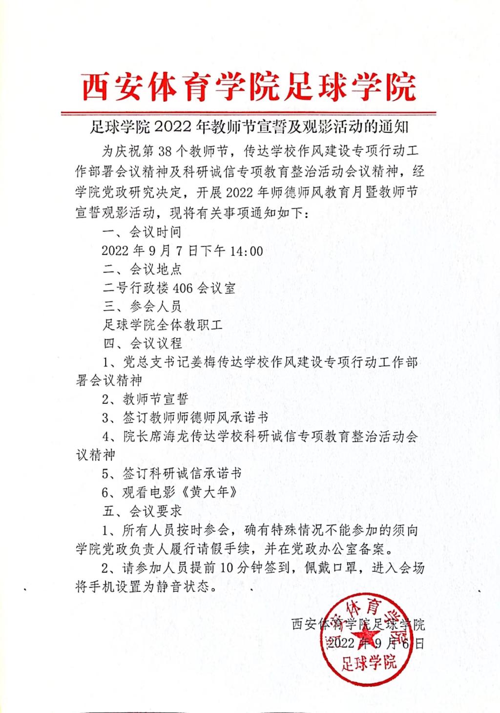 【师德师风教育月】足球学院2022年教师节宣誓及观影活动的通知