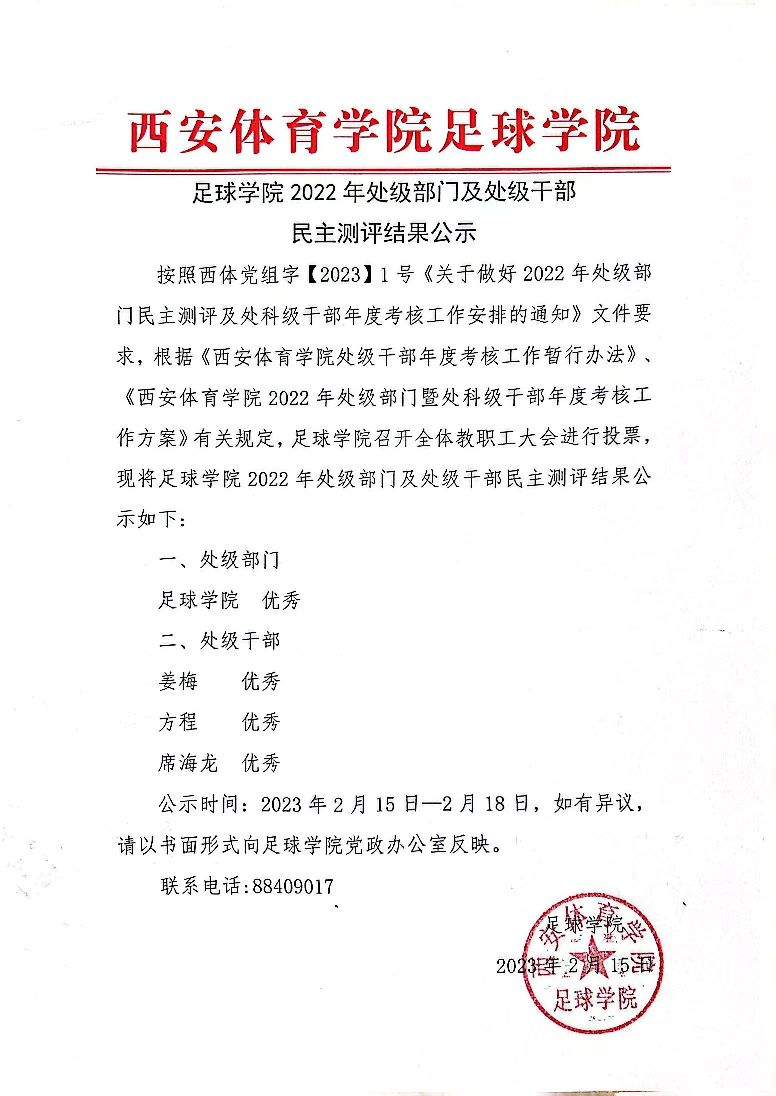足球学院2022年处级部门及处级干部民主测评结果公示