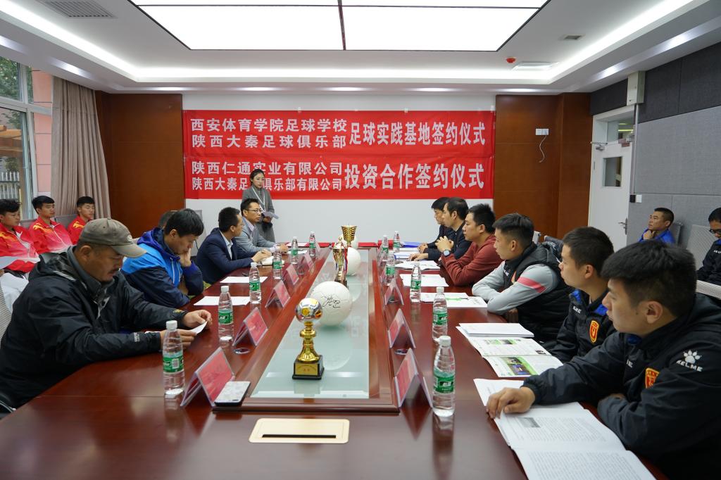 2017年10月16日下午,西安体育学院足球学院与陕西大秦足球俱乐部足球教学实践基地签约仪式在西安市未央区青少年活动中心会议厅举行。足球学院院长朱军、足球学院足球教研室主任席海龙、足球学院办公室主任岳志铁、足球学院足球教研室教师黑晓虎、张雁飞,陕西大秦足球俱乐部董事长韩文德、陕西仁通实业有限公司董事长黄鹏、陕西大秦足球俱乐部总经理秦新锐、陕西大秦足球俱乐部竞训总监骆文龙及教练组代表出席了签约和授牌仪式。