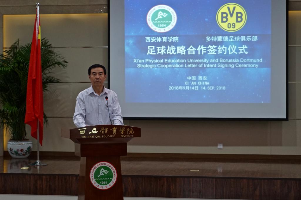 朱元利院长代表学校致辞。朱元利介绍了学校的办学成就,并指出,此次西安体育学院与多特蒙德足球俱乐部的成功牵手,将会促进足球学院在开阔国际视野、转变足球办学思路、提升专业建设水平、完善教学训练体系、创新人才培养模式等方面开创新局面。